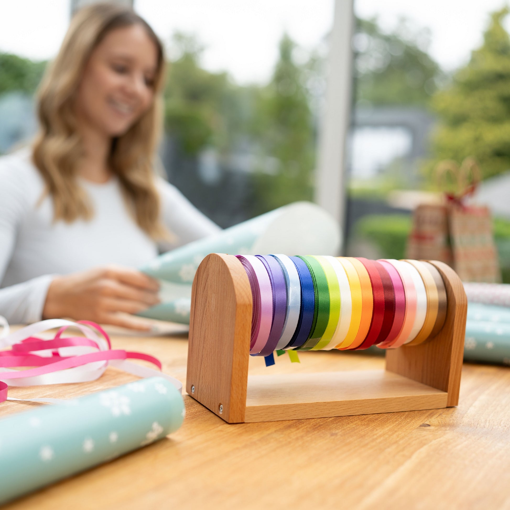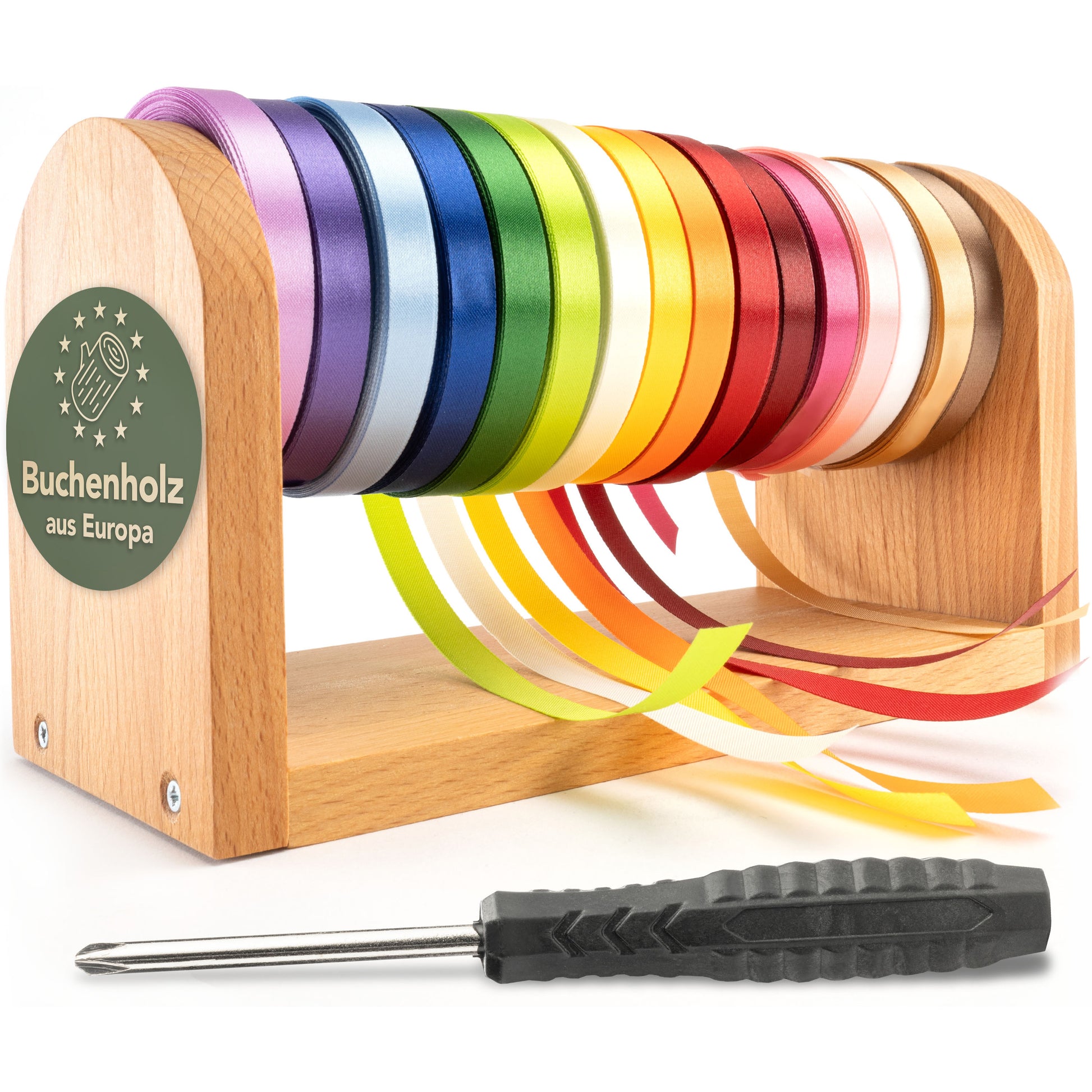 FACTS: Satin ribbons colored, 16 rolls and colors, 23 meters per roll, 10 mm, can be used on both sides, dispenser in beech wood, including screwdriver for quick self-assembly
