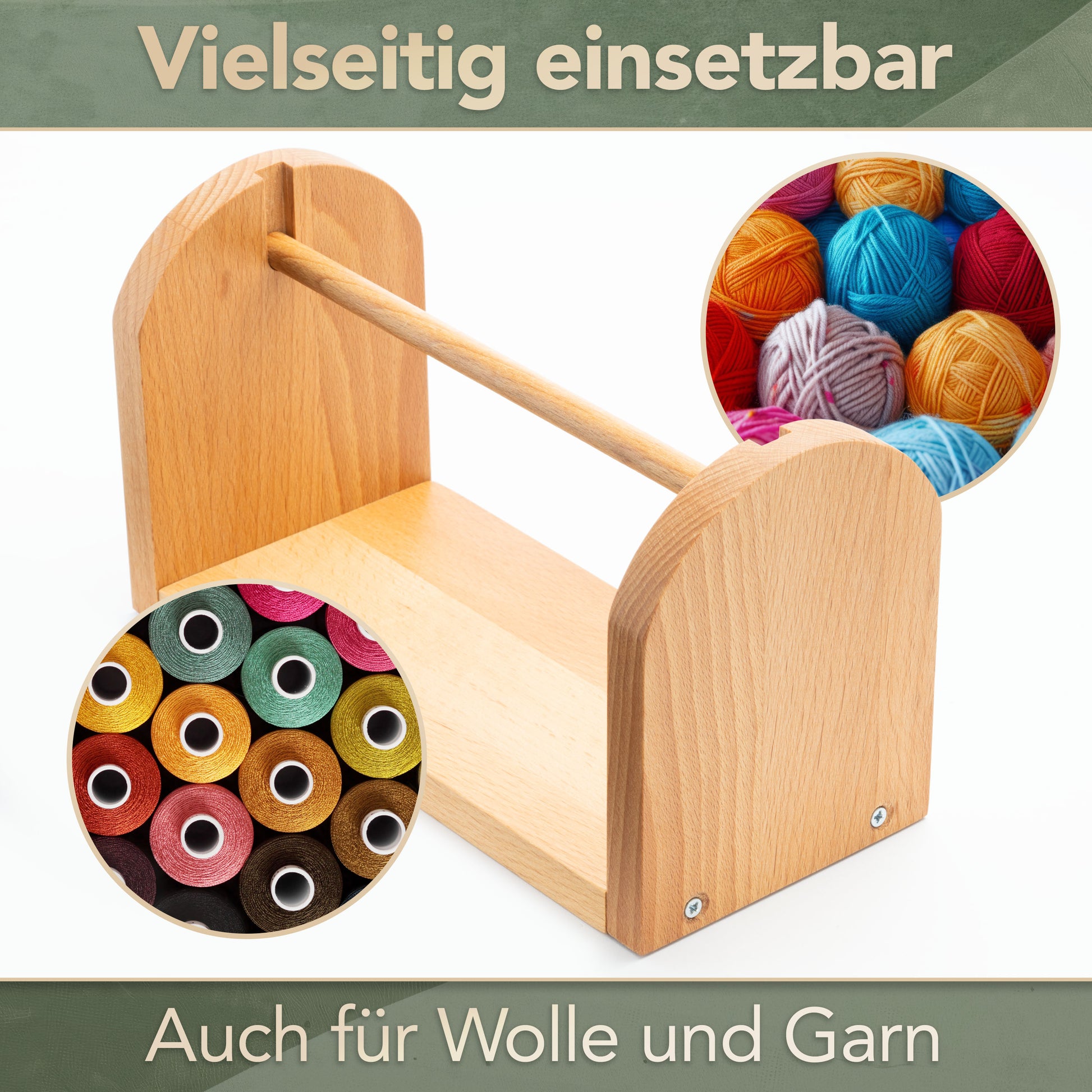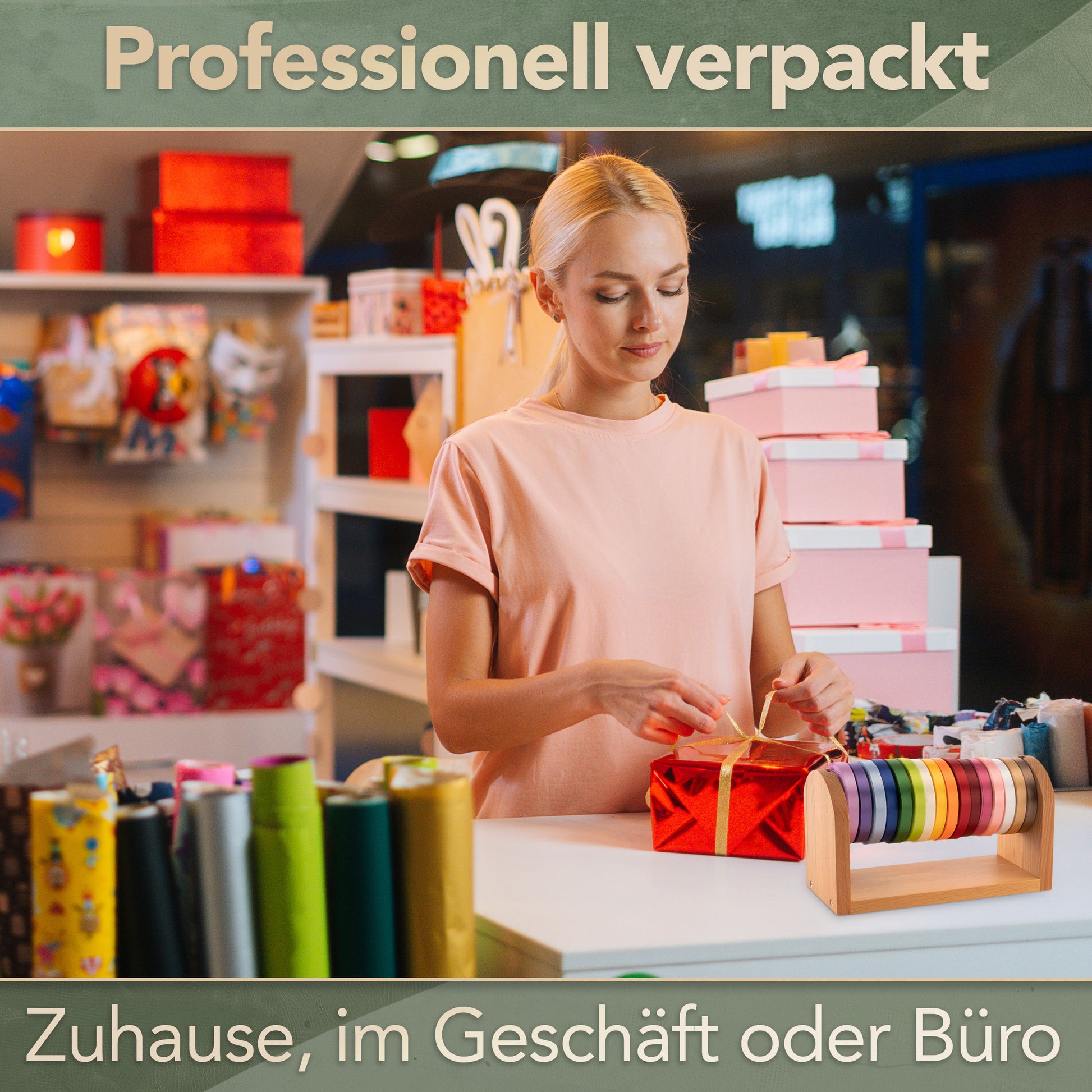 ADVANTAGE: The satin ribbon is resistant to fraying, colorfast and water-resistant. The dispenser has been sustainably oiled (no color transfer possible) and the wood is from local forests. Also suitable as a wool winder or yarn holder