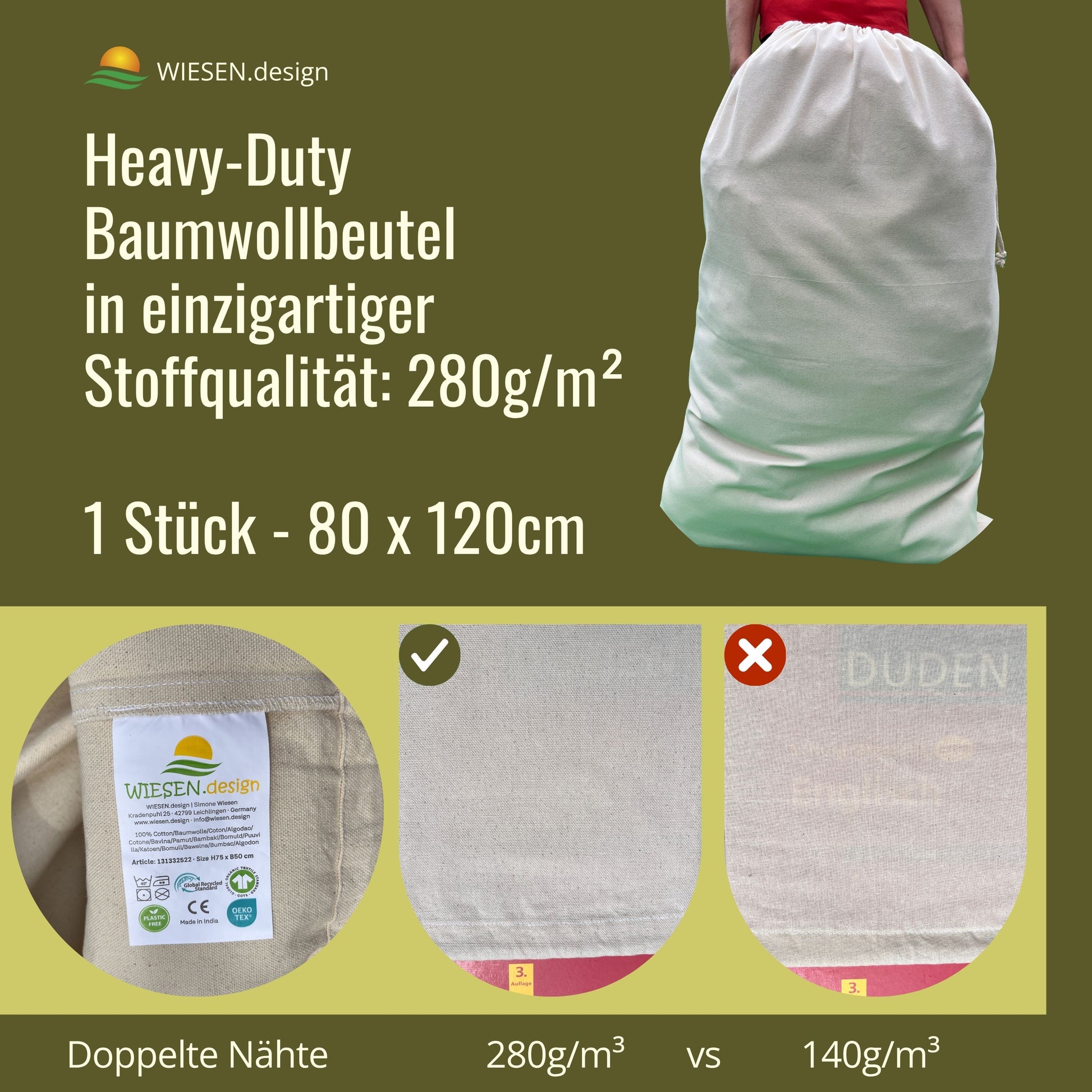 EXTRA DICHTER STOFF 280 g/m² - Heavy-Duty Stoffbeutel mit doppelter Stoffdichte. Blickdicht, robust, waschbar (40 °C) und langlebig für tägliche Nutzung.