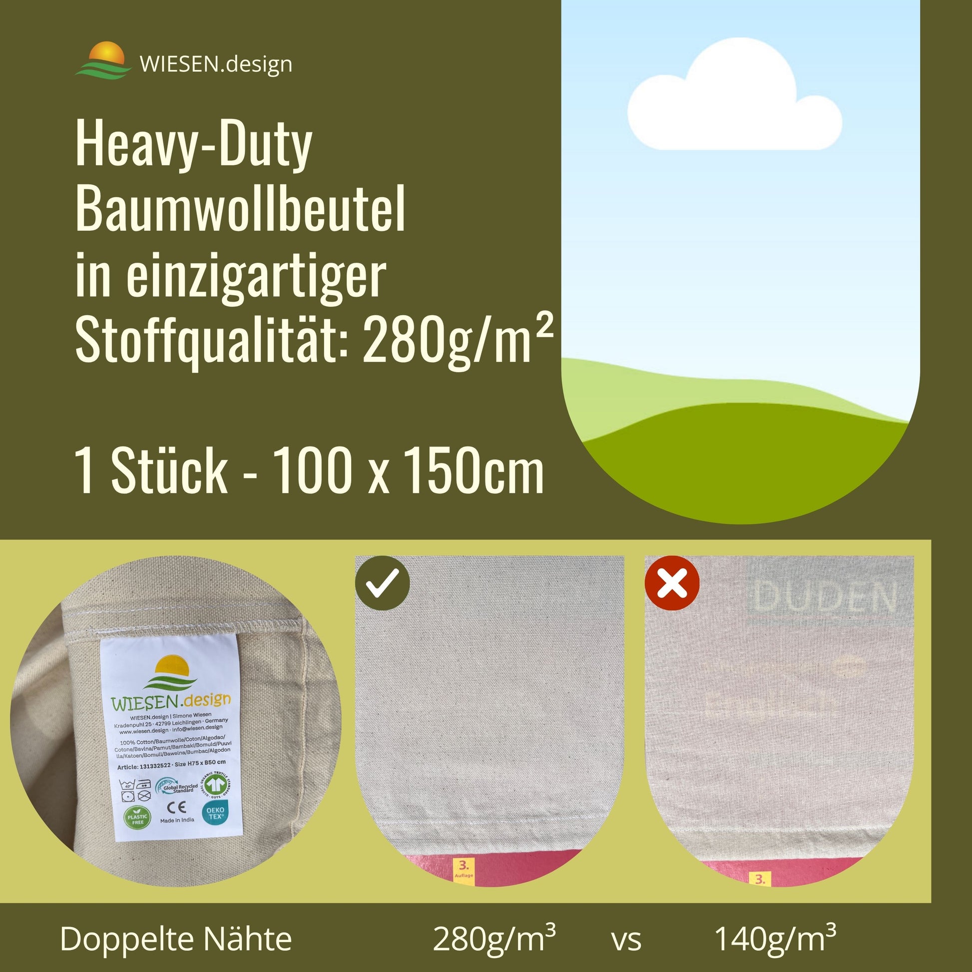 EXTRA DICHTER STOFF 280 g/m² - Heavy-Duty Stoffbeutel mit doppelter Stoffdichte. Blickdicht, robust, waschbar (40 °C) und langlebig für tägliche Nutzung.